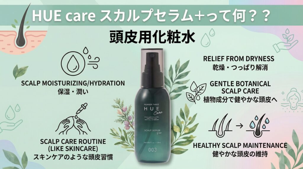 HUEcareスカルプセラム+は、乾燥しやすい季節の頭皮にうるおいを補いながら、コンディションを整えて健やかな状態へ導いてくれます。ベタつきが気になる方も、頭皮の水分・皮脂バランスが整うことで、すっきり快適に感じやすくなります。