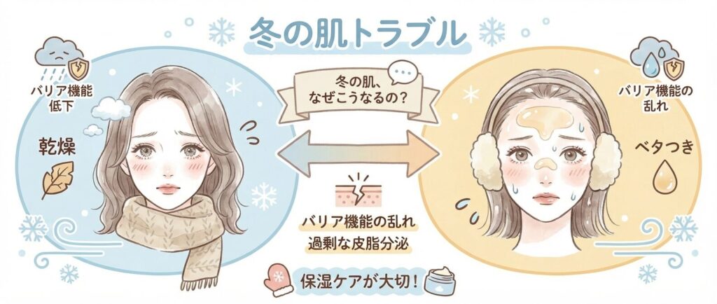 でも実は、乾燥によって肌のバリア機能や水分・皮脂のバランスが乱れ、人によっては皮脂が過剰に出てしまったり、乾燥しているのに表面はベタつくように感じることがあります。